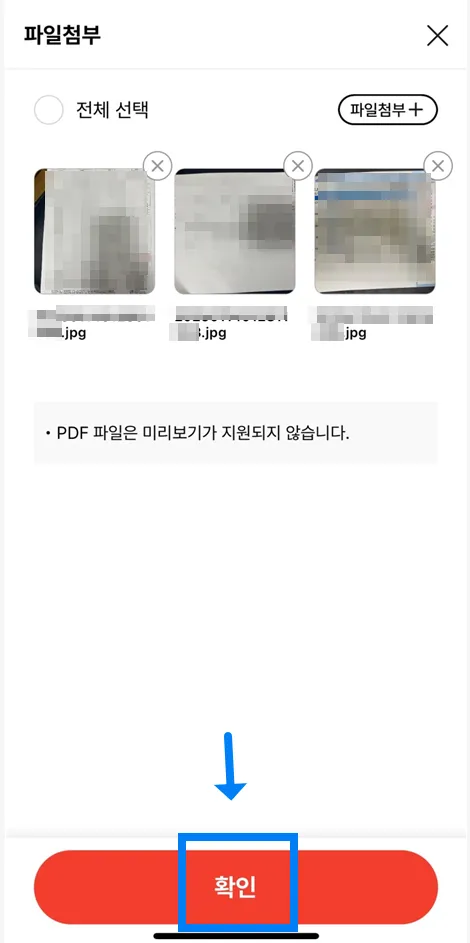 저는 진료비 영수증, 약국 영수증, 진료비 세부내역서 사진 이렇게 3장을 첨부해 주었습니다. 첨부 후 아래에 '확인'을 눌러줍니다.