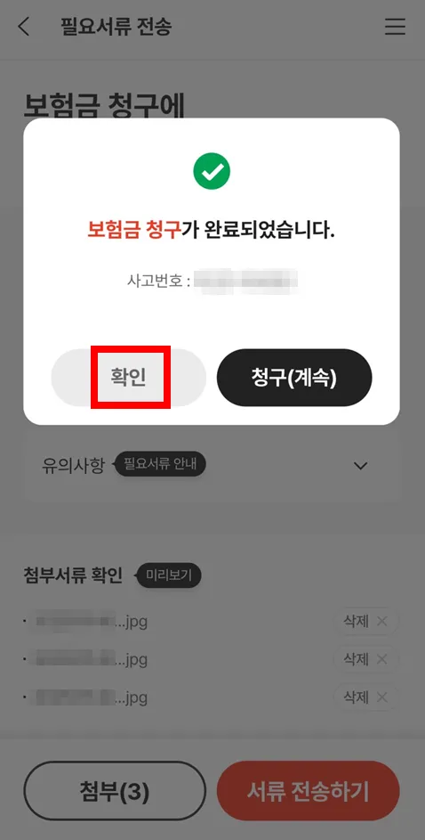 '보험금 청구가 완료되었습니다.'라는 메시지창과 사고번호가 나오면 '확인'을 눌러주면 끝입니다. 카톡으로도 보험금 청구 접수 알림톡이 옵니다.