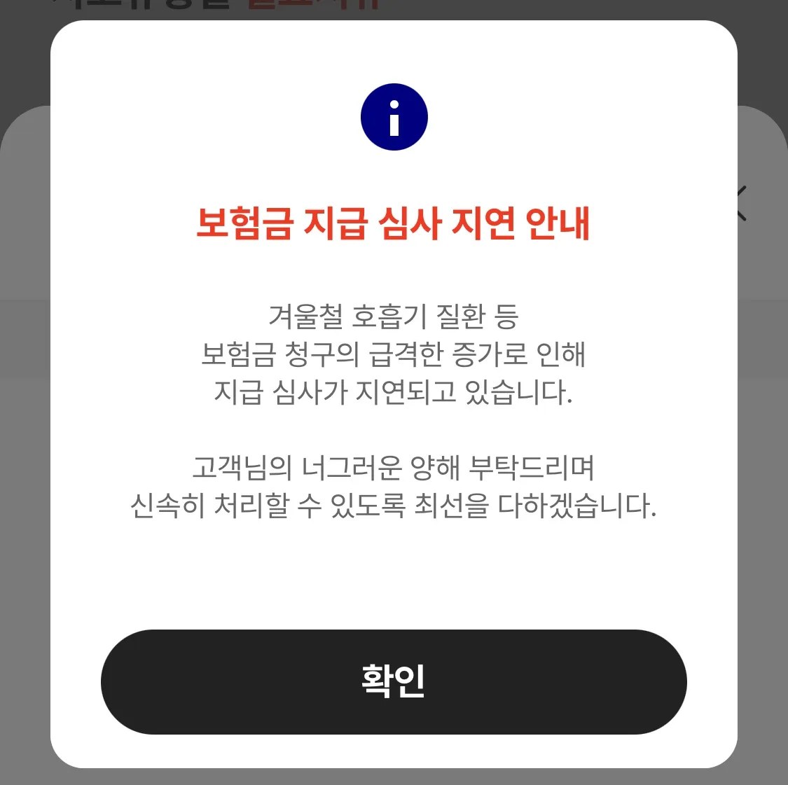 겨울철 호흡기 질환 등 보험금 청구의 급격한 증가로 인한 '보험금 지급 심사 지연 안내' 메시지 창이 떴어요. 독감 유행으로 인한 청구가 정말 많긴 많나 봅니다.