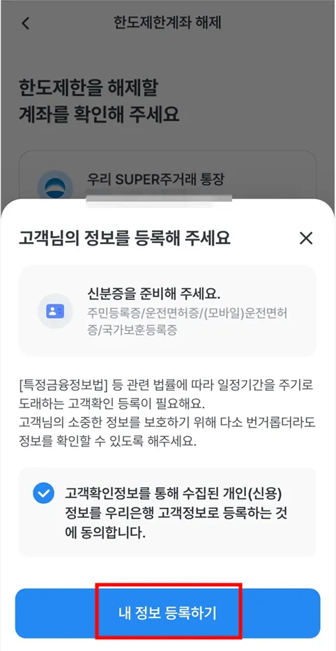 신분증(주민등록증, 운전면허증/ (모바일) 운전면허증/국가보훈등록증)을 준비하고 '내 정보등록하기'를 누릅니다.