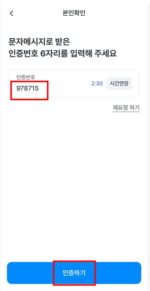 문자로 받은 인증번호 6자리를 입력하고 '인증하기'를 누릅니다.