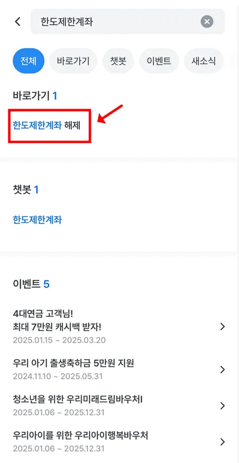 '한도제한계좌해제' 바로가기를 눌러줍니다.