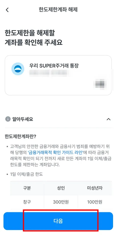 (단, 한도제한계좌서비스 해제를 요청하시는 계좌의 급여 입금내역 등 추가 확인이 필요할 수 있음)