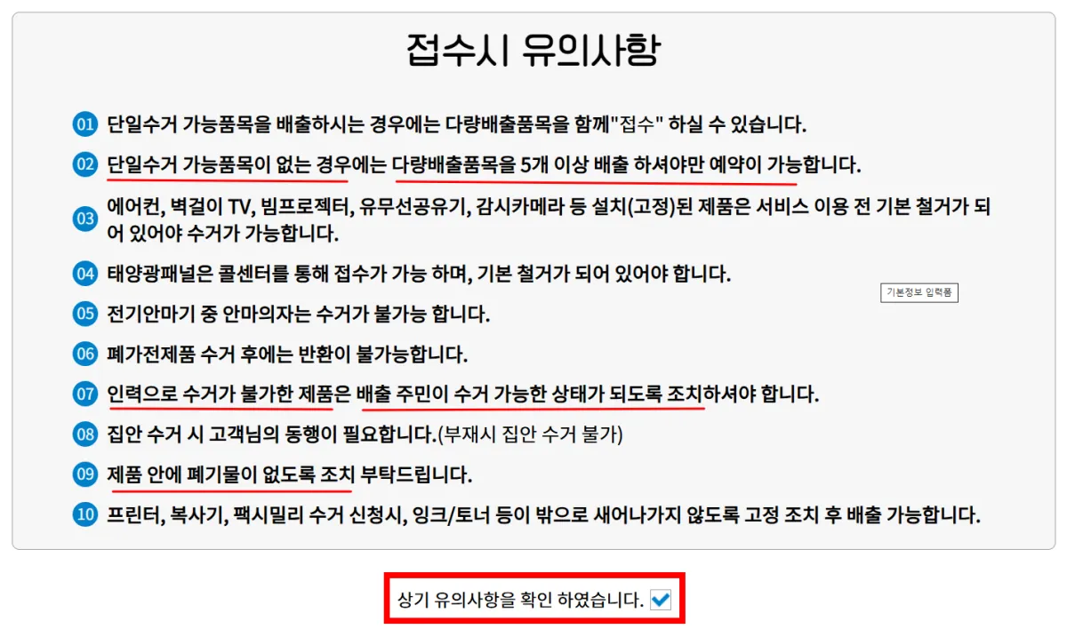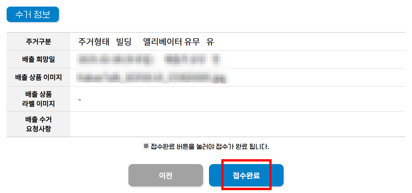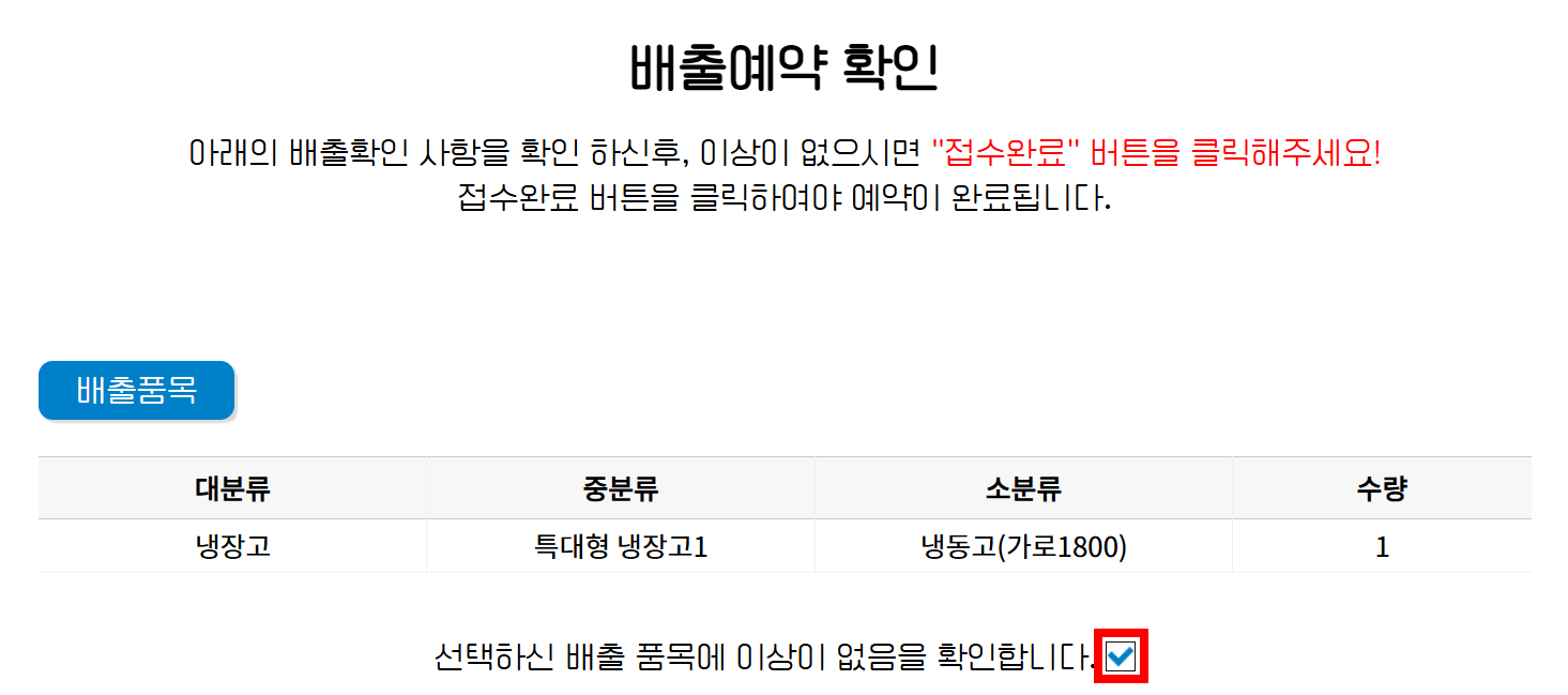 '배출예약 확인' 화면에서 내용이 정확한지 확인 후 '배출 품목에 이상 없음 확인'에 체크하고 하단에 '접수 완료'를 눌러줍니다.