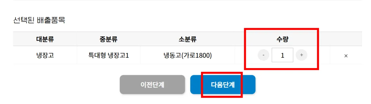 '선택된 배출 품목'에서 수량을 선택하고 '다음단계'를 누릅니다.
