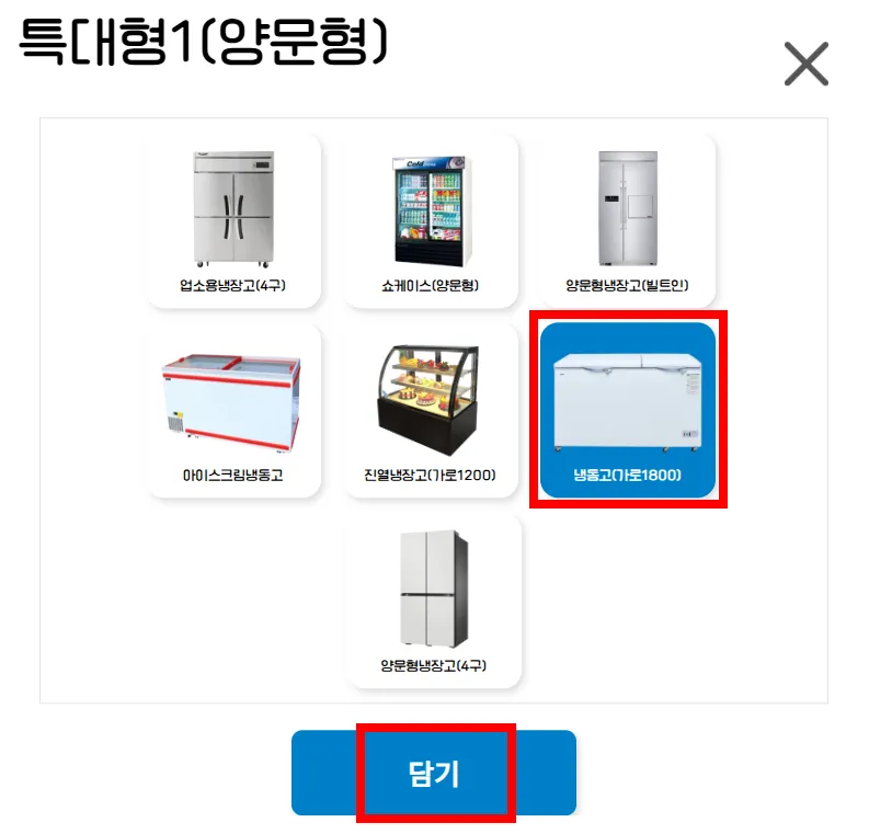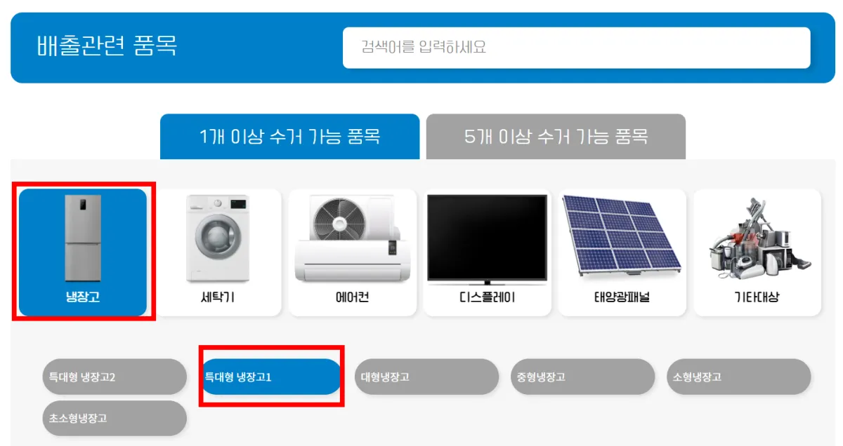 예를 들어 냉장고의 경우 아래 사이즈별로 (대형냉장고, 중형냉장고, 소형냉장고 등) 분류가 되어있는데요. 항목을 클릭하면 예시 사진도 나와있어 참고하시면 됩니다.