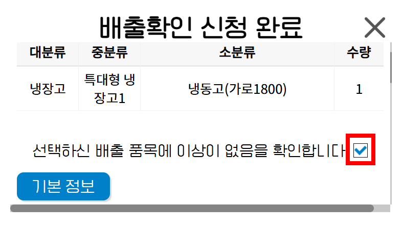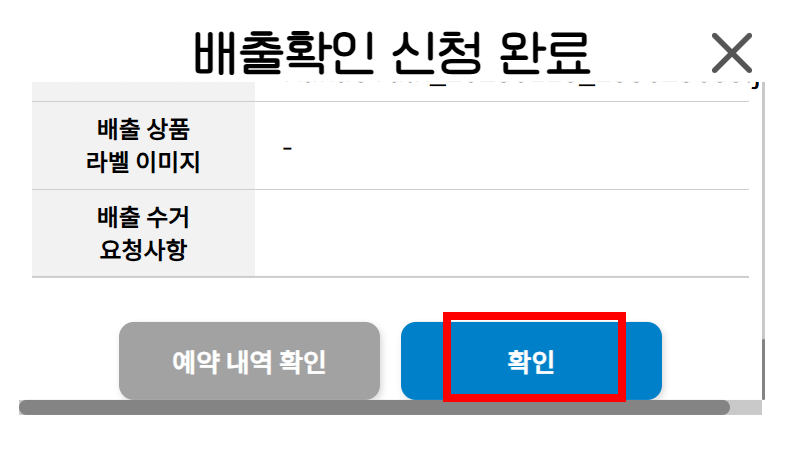 '배출확인 신청 완료' 팝업창이 뜨는데 한번더 '배출 품목에 이상이 없음을 확인'에 체크하고 입력내용 확인 후 맨 아래 '확인'을 눌러줍니다.