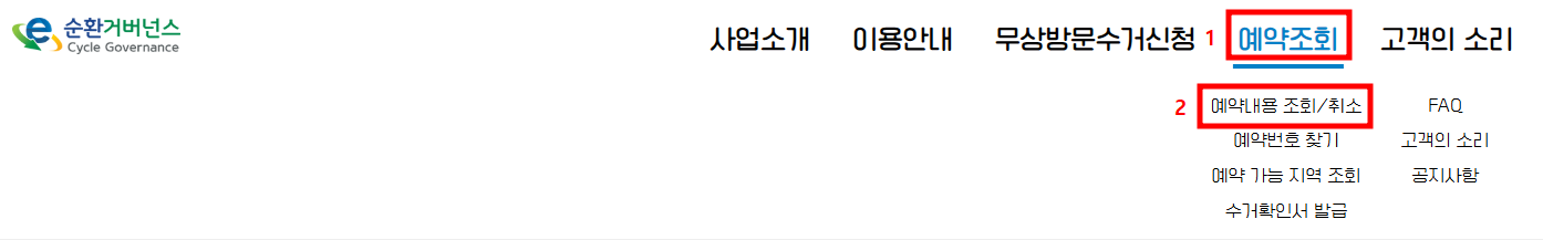 '예약조회'에 마우스를 대고 아래 나오는 '예약내용조회/취소'를 클릭합니다.