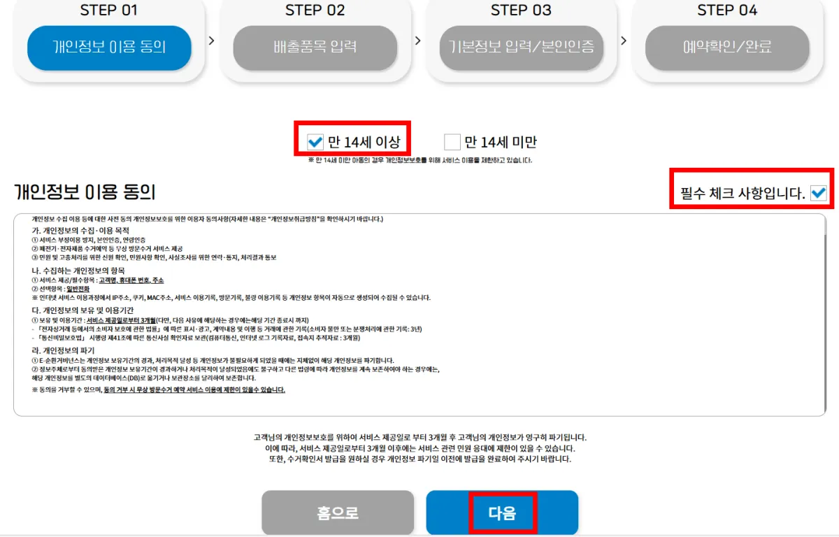 '만 14세 이상'에 체크, '필수 체크 사항입니다.'에 체크 후 하단에 '다음'을 클릭합니다.