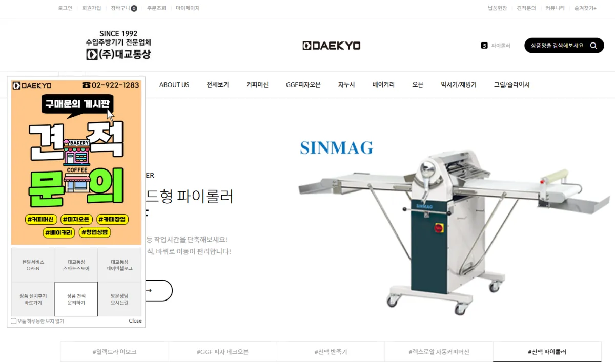 이 사이트에서도 피자오븐뿐만 아니라 커피머신, 믹서기/제빙기 등 구매가 가능합니다. 대교통상의 경우 렌탈서비스도 가능하네요.