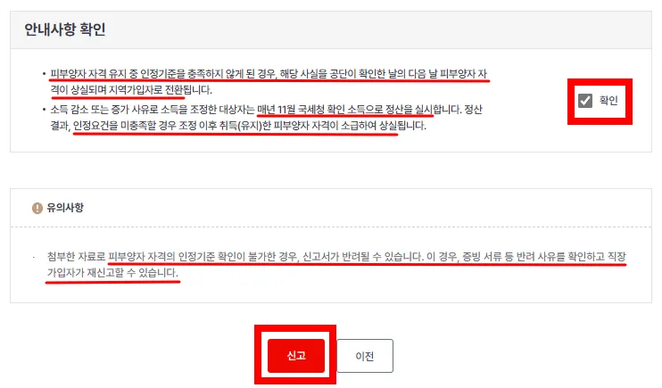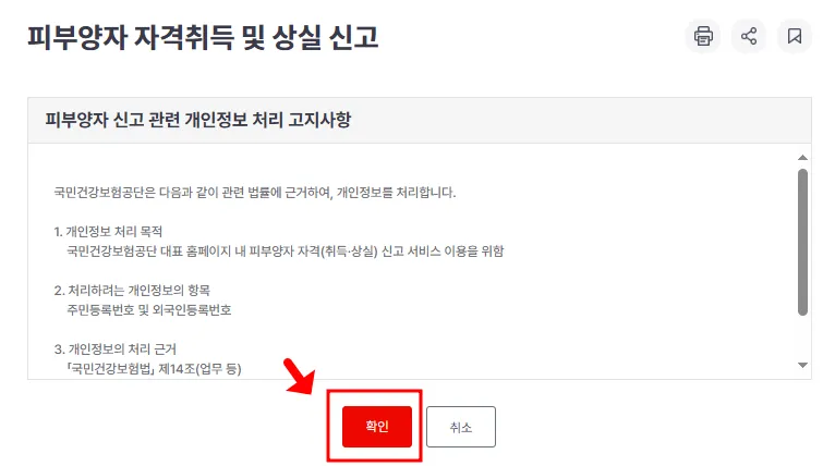 '피부양자 신고 관련 개인정보 처리 고지사항'을 읽고 '확인'을 누릅니다.