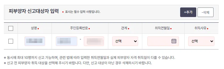 '피부양자 신고대상자 입력'란에 등록할 대상 정보를 입력합니다. 맨 왼쪽에 박스에 체크도 해주셔야 합니다.