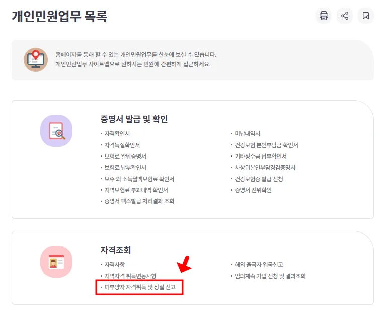 '자격조회' 카테고리에 있는 '피부양자 자격취득 및 상실 신고'를 클릭합니다.