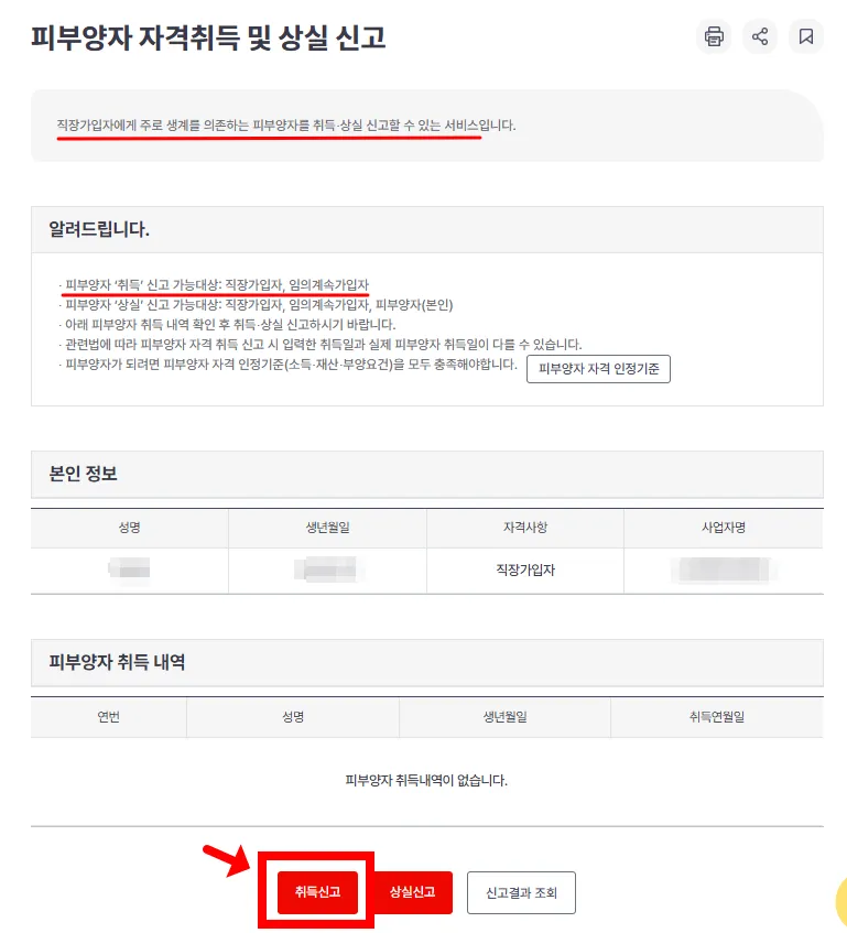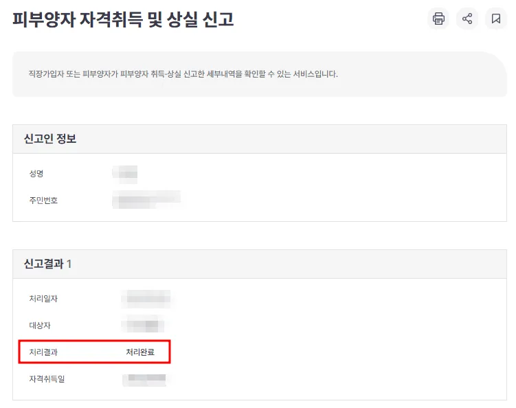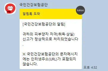 피부양자 취득 신고가 완료되었습니다. 처리완료시 알림톡 또는 문자를 통해 처리 결과를 알려준다고 합니다.