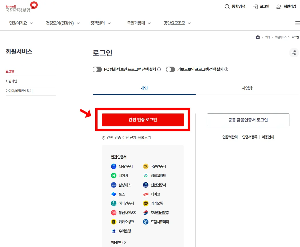 신고인(직장가입자)이 '간편 인증로그인'을 통해 국민건강보험 사이트에 로그인합니다.