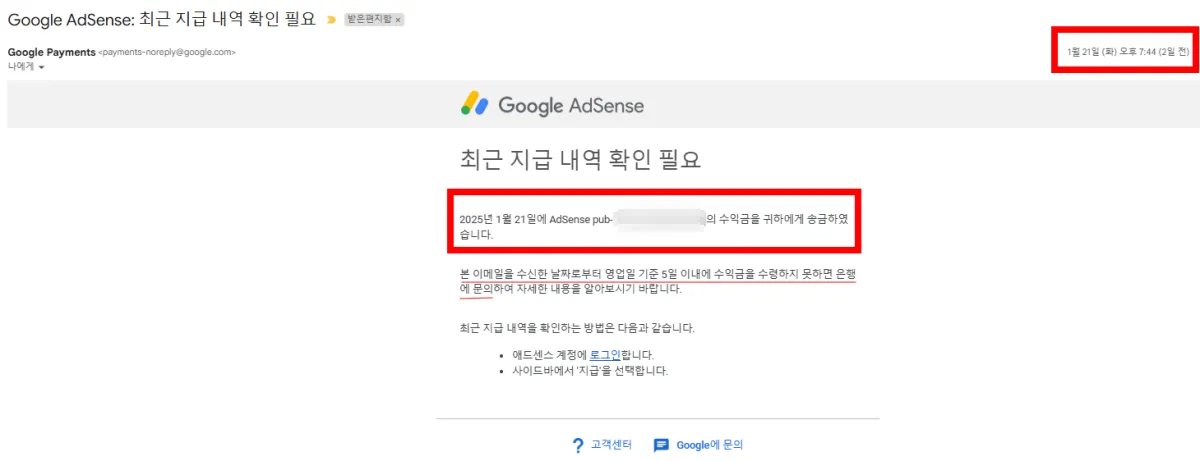 애드센스 수익 지급 기준을 달성했다는 가정하에 보통 매달 21~22일경에 Google Payments로부터 메일이 옵니다. 수익금을 송금했다는 내용입니다.
