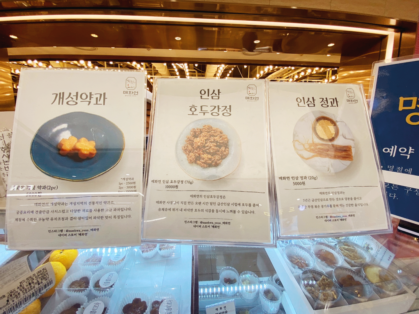 개성약과, 인삼호두강정, 인삼정과, 약식에 대한 설명과 가격은 아래 사진을 참고해 주세요! 현장에서 시식을 해보고 구매 결정을 하실 수 있습니다.