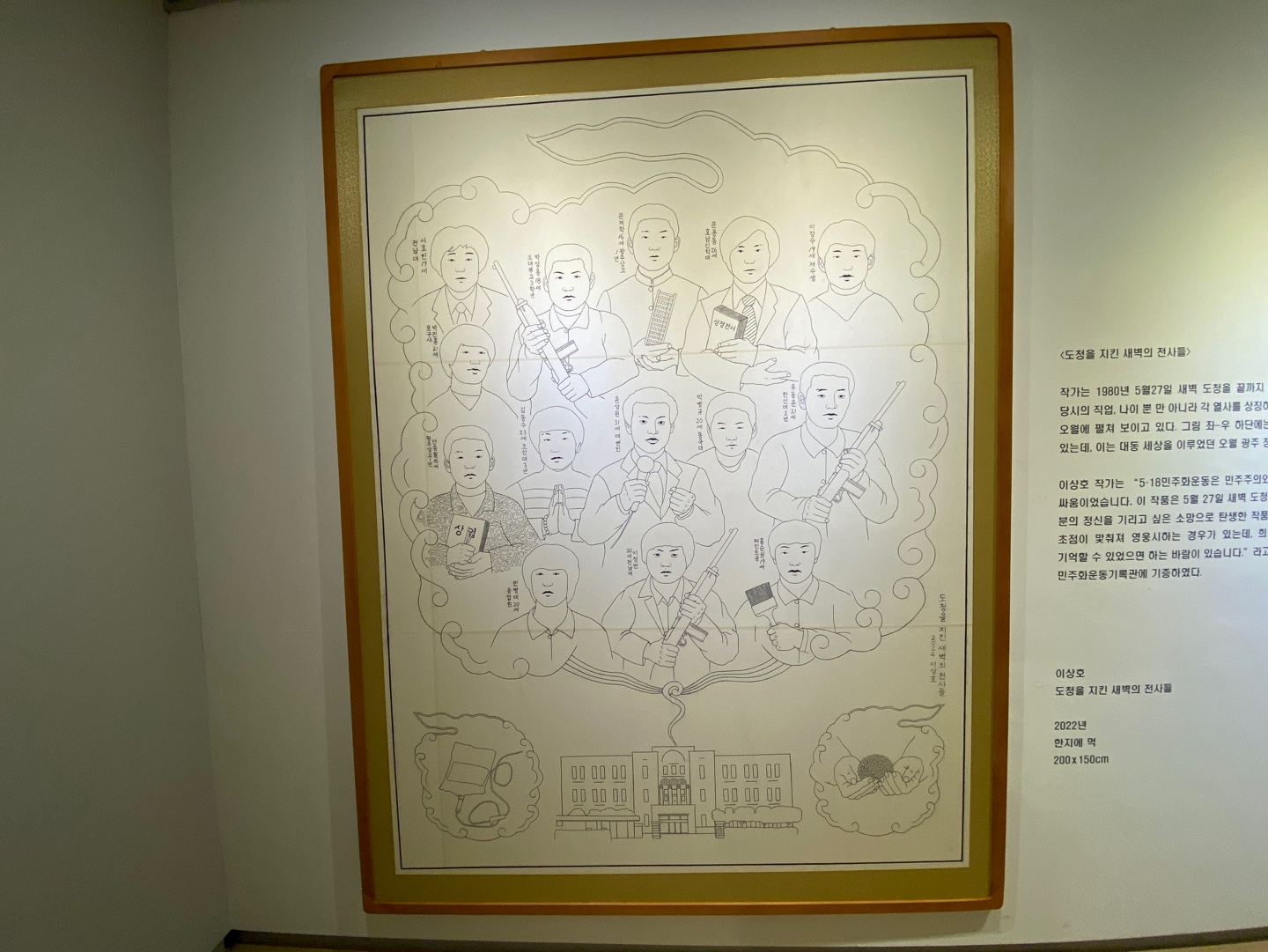 아래는 이상호 작가님의 '도청을 지킨 새벽의 전사들'이라는 작품입니다. 1980년 5월 27일 새벽 도청을 끝까지 사수하다 사망한 열사들의 이름, 직업, 나이뿐만 아니라 각 열사를 상징하는 소재를 함께 그려 넣었다고 해요.