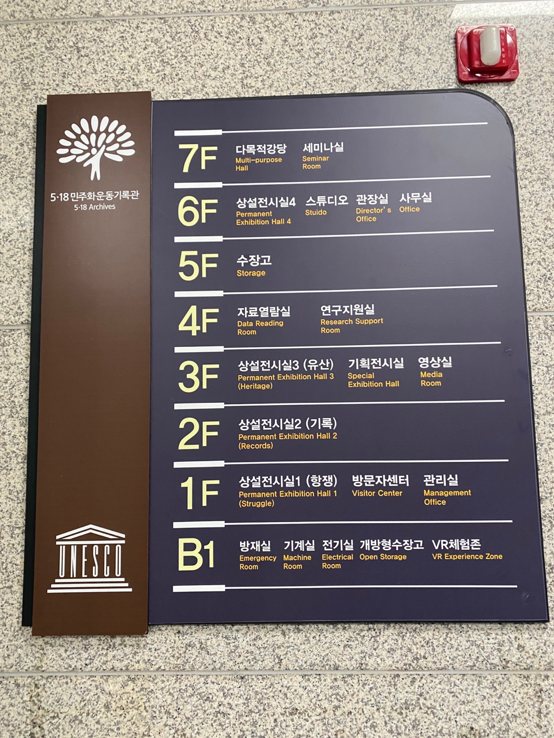 5.18 민주화운동기록관 건물은 7층까지 있는데 해설사분의 해설은 1층 상설전시실 1(항쟁)과 2층 상설전시실(기록)까지 해주십니다. 1시간 정도 소요되더라고요.