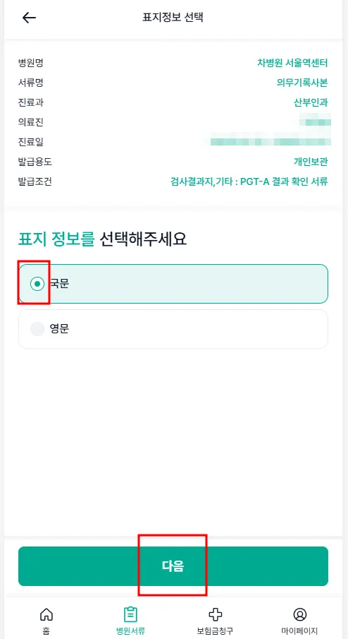 병원 서류를 선택합니다. PGT-A 결과는 '의무기록사본'에 체크해주면 되는데요.