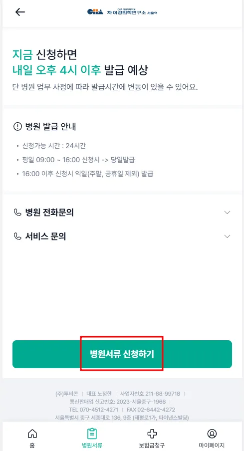 오후 4:22쯤 신청했더니 지금 신청하면 내일 오후 4시 이후 발급 예상이라고 하네요. 단 병원 업무 사정에 따라 발급시간에 변동이 있을 수 있다고 합니다.