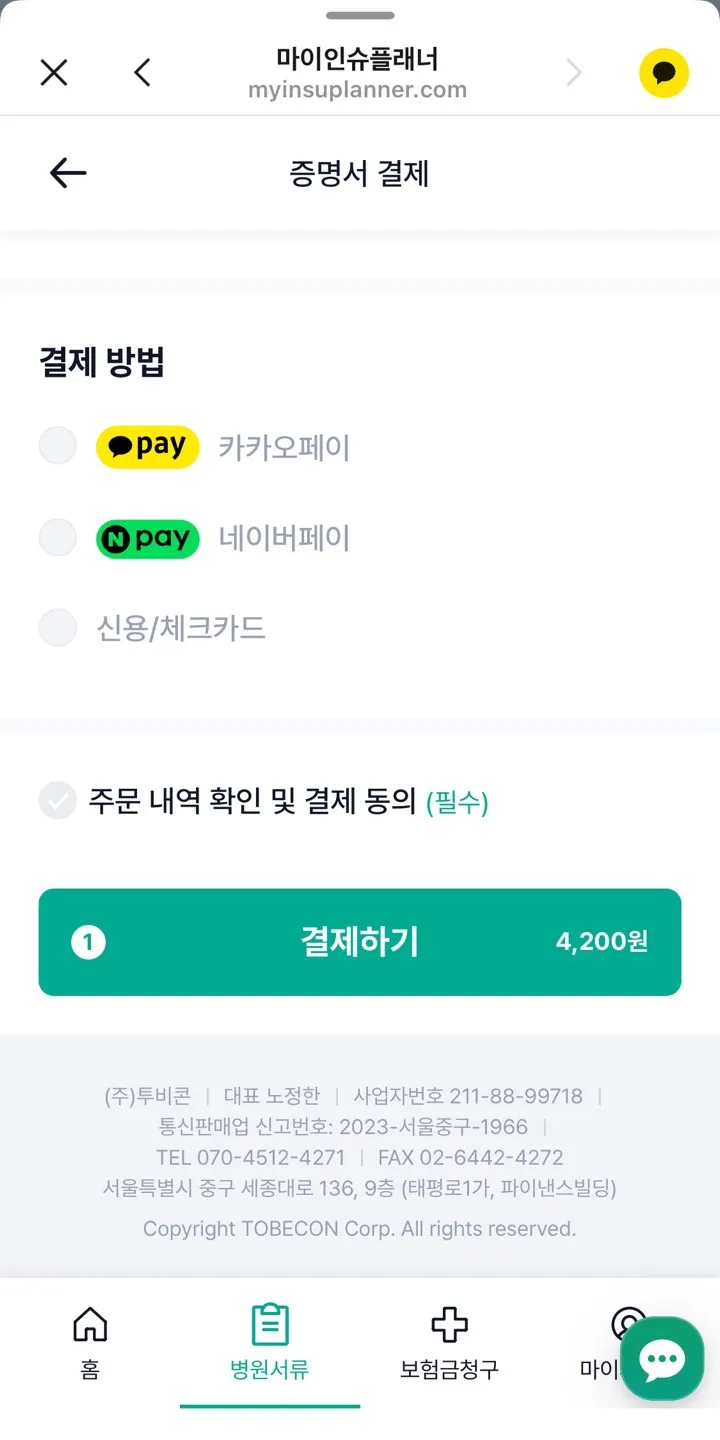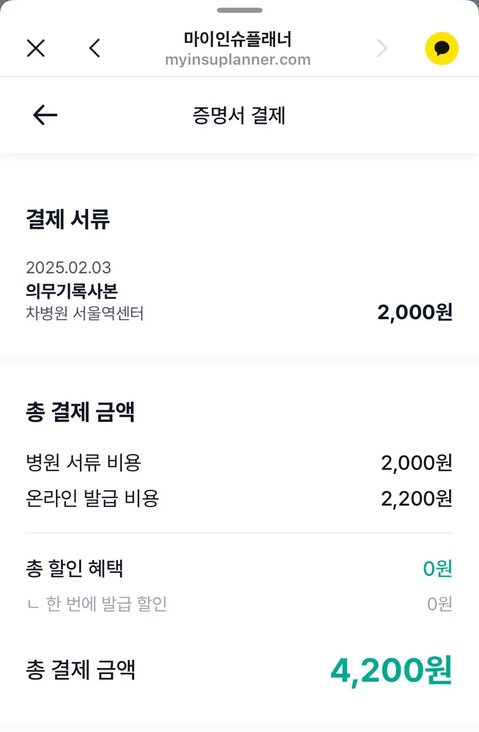병원 서류 비용은 2,000원 그리고 온라인 발급 비용 2,200 원해서 총 결제 금액은 4,200원입니다.