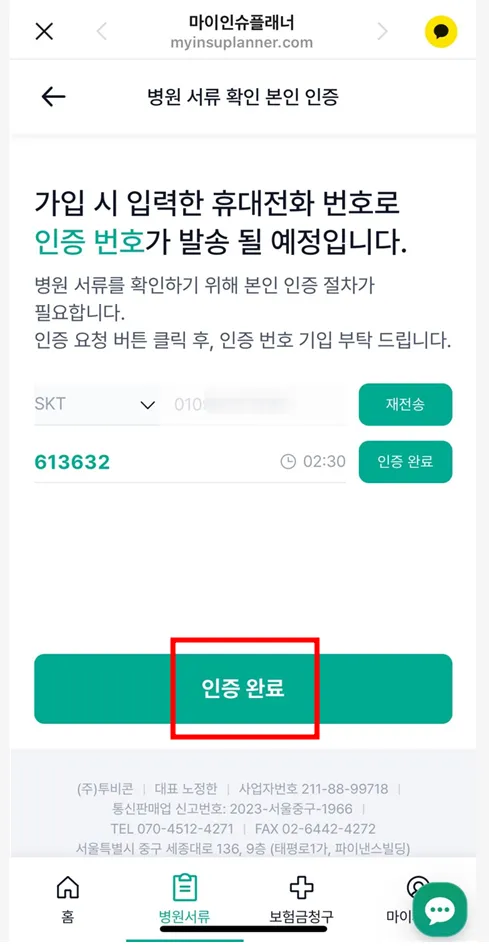 마이인슈플래너 가입 시 입력한 휴대전화 번호를 입력해 인증절차를 거쳐줍니다.