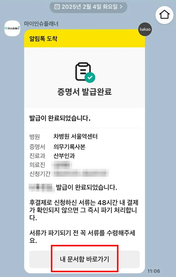 예전에는 오후 4시 전에 신청했더니 약 10분 만에 결과를 받아볼 수 있었는데 이번에는 오후 4시 이후에 신청했더니 다음날 오전 11시경에 발급이 되었습니다. 아래와 같이 마이인슈플래너로부터 카톡을 받았어요.