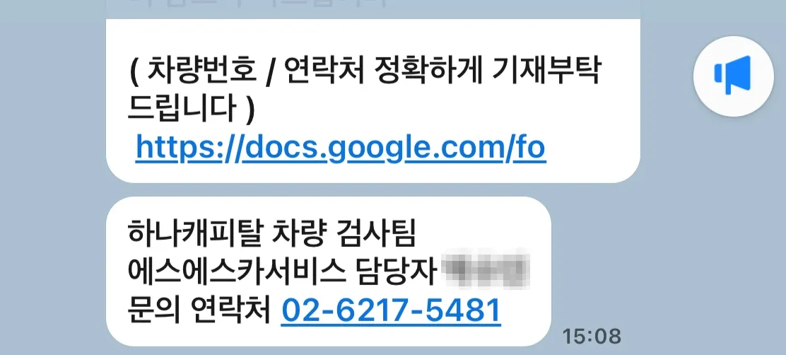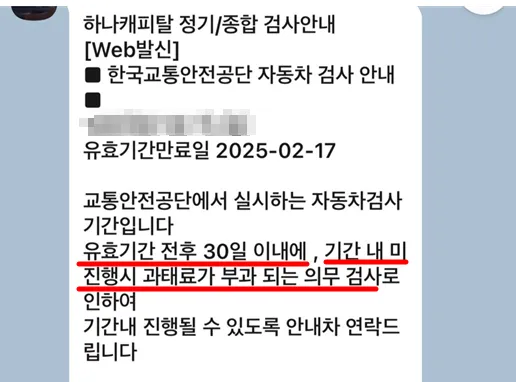자동차는 하나캐피탈에서 장기렌트한 차량인데요. 아래와 같이 메시지를 받게 되었습니다. 메시지에 기재된 유효기간 만료일은 2025-2-17인데 전후 30일 이내에 검사를 받으면 되기 때문에 최종 만료일은 3월 17일이었습니다.