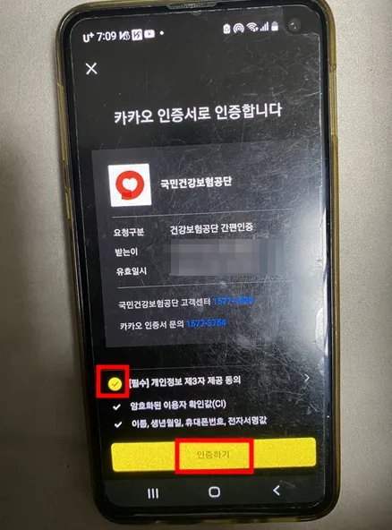 '[필수] 개인정보 제3자 제공동의'에 체크하고 '인증하기'를 누릅니다.
