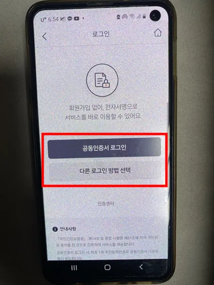 '공동인증서 로그인' 또는 '다른 로그인 방법 선택'중에 본인이 편한 방법으로 진행합니다. 저는 '다른 로그인 방법 선택'을 눌러 진행해 볼게요!