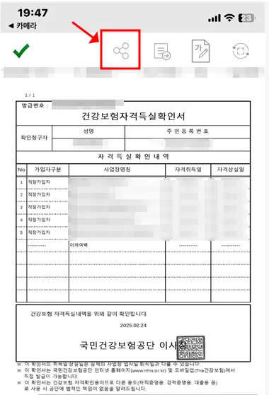 팩스에서 아래와 같이 '건강보험자격득실확인서'를 확인할 수 있고 위에 '공유' 버튼을 누르면 카톡, 메시지, 이메일로도 보낼 수 있으니 참고해 주세요!