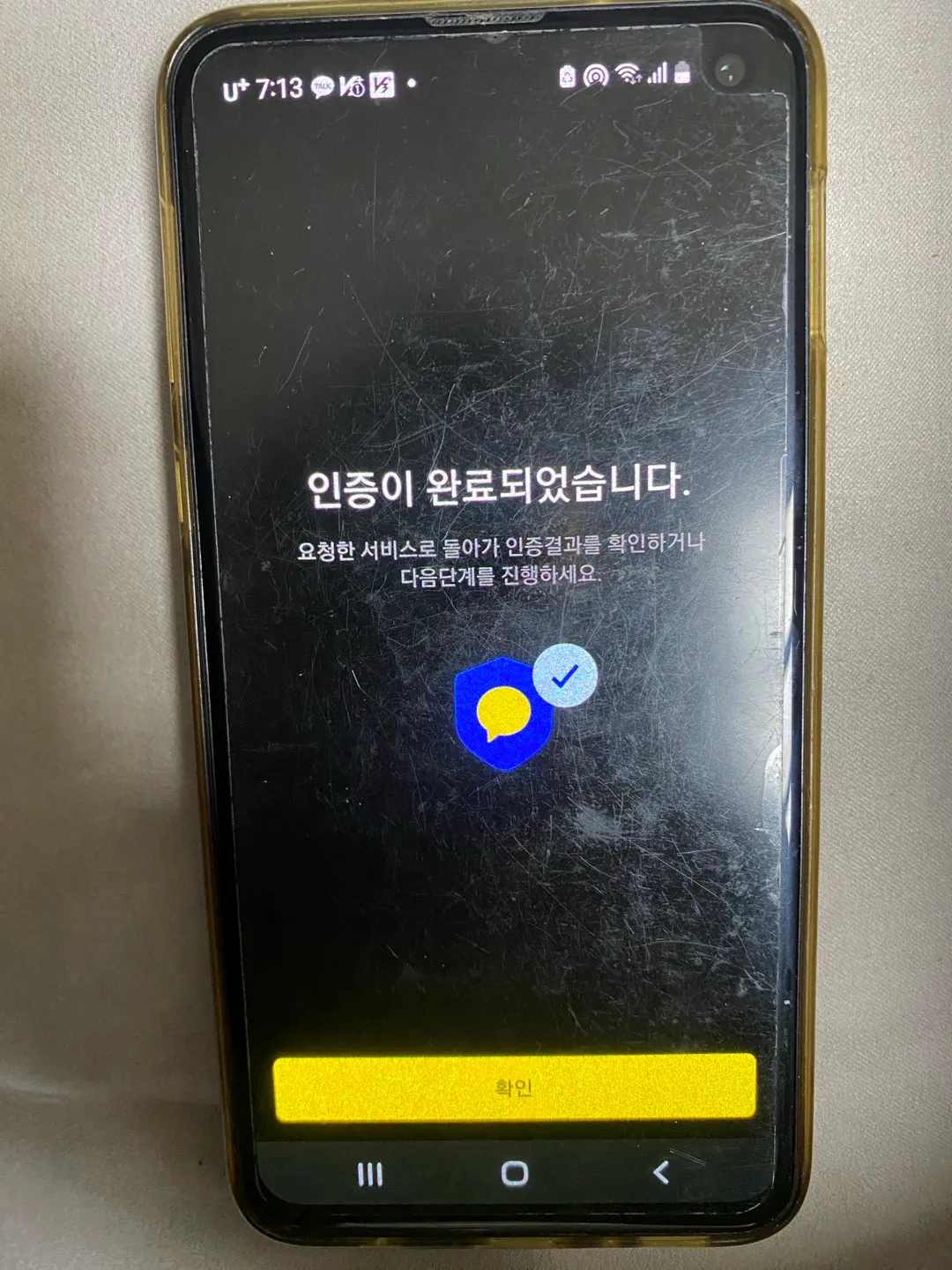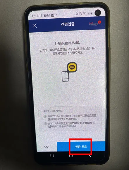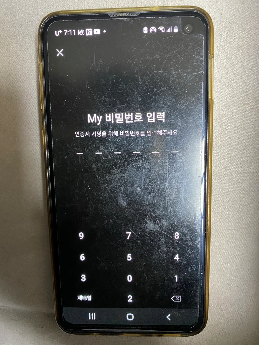 인증서 서명을 위해 비밀번호(숫자)를 입력해 줍니다. 인증 완료 화면이 나오면 '확인'을 누릅니다.