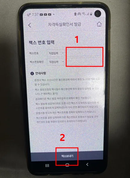 저는 '팩스'로 받기를 신청하였습니다. 서류를 받을 팩스 번호를 2번 입력하고 아래 '팩스 보내기'를 눌러 주면 됩니다. 저는 모바일 팩스 어플을 사용하고 있는데 무료이고 정말 편하더라고요.