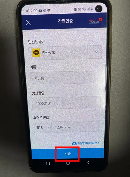 '카카오톡'으로 선택한 경우 이름(영문 이름, 여권 및 외국인등록증과 동일하게 입력), 생년월일(숫자만), 휴대폰 번호(외국인 명의 핸드폰 번호 입력)를 입력합니다.