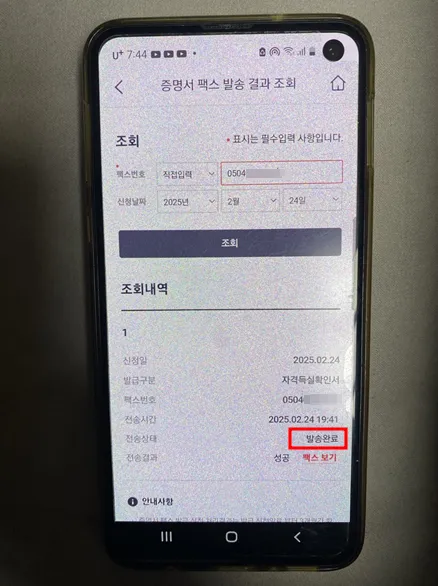 '증명서 팩스 발송 결과 조회' 화면에서 '신청날짜', '팩스번호'를 입력하고 '조회'를 누르면 전송상태가 처음엔 '대기'이다가 '발송완료'로 바뀝니다.