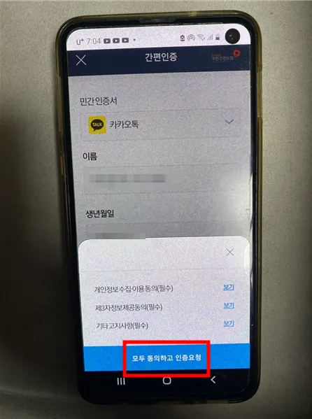 개인정보수집·이용동의, 제3자정보제공동의, 기타 고지사항 내용 확인 후 하단에 '모두 동의하고 인증요청'을 누르고 인증을 진행해 줍니다.