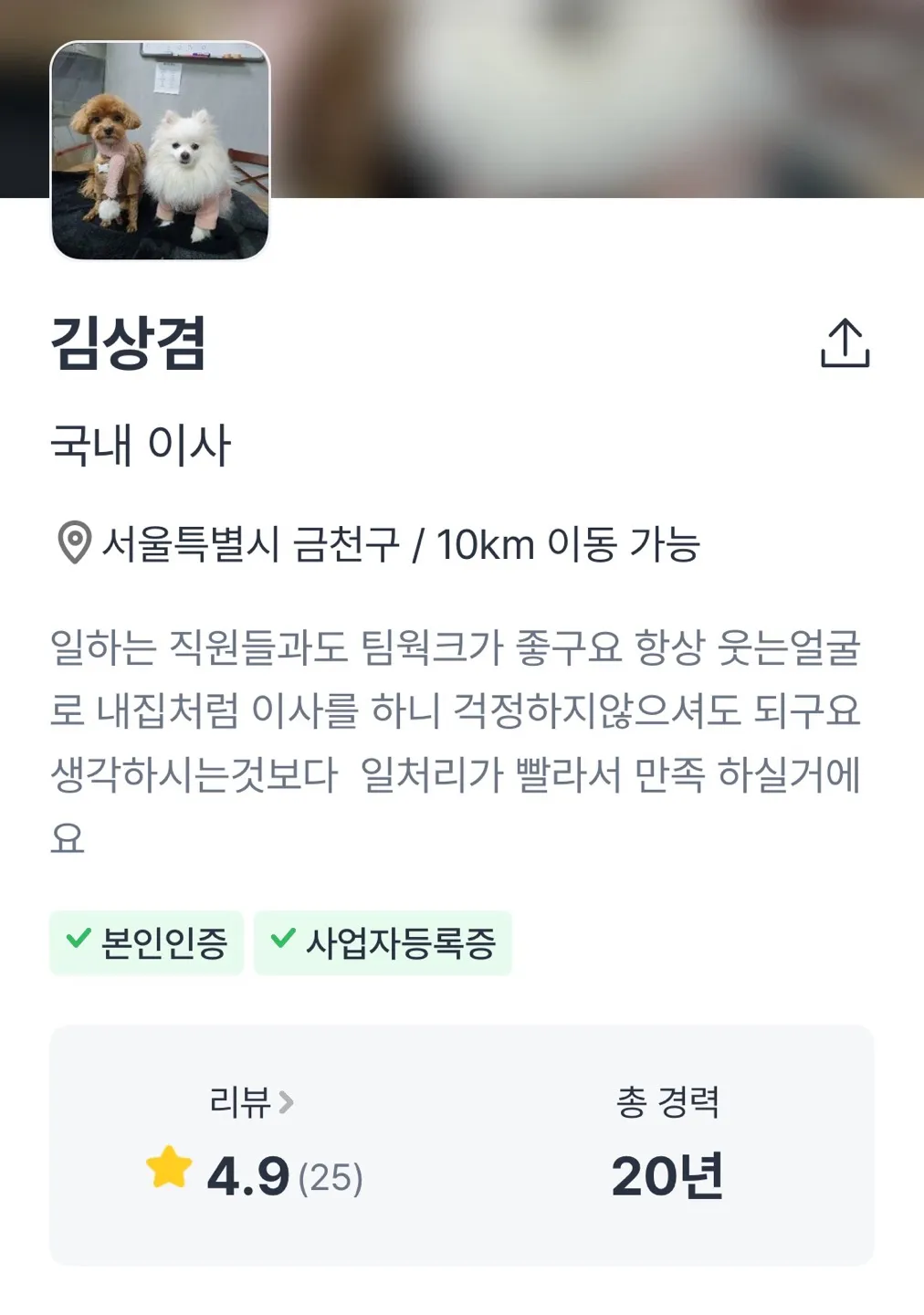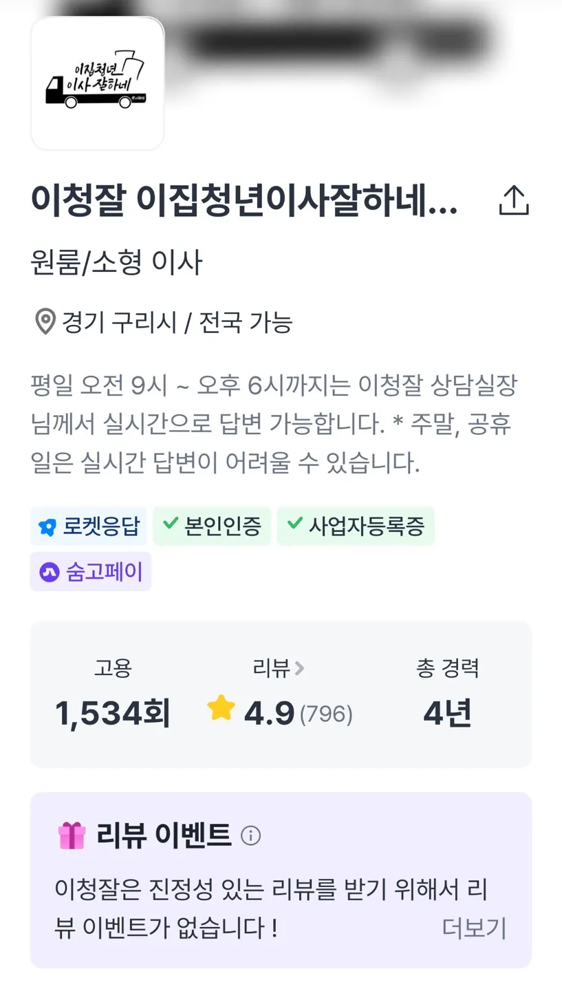 우리이사의 경우도 평점도 4.9로 높고 리뷰도 좋고 가격도 합리적이었어요. 답변도 자세히 주시고 전화상담 시 친절하게 잘 설명해 주셨습니다.