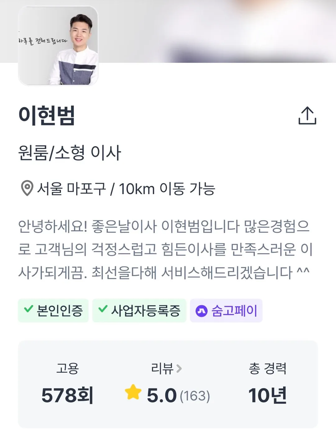 이분도 리뷰도 좋으시고 친절하셨어요. 가전, 가구 이사 당일 포장해 준다고 하셨고 이사바구니나 박스는 필요시 대여 가능하다고 하시더라고요. 저희 집에 방문하셔서 직접 보시고 정확한 견적을 확인해 주실 수도 있다고 하셨어요.