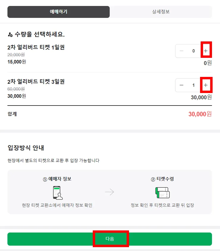 '2차 얼리버드 티켓'이라고 적힌 박스 부분을 누릅니다.