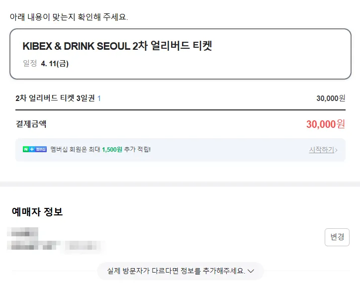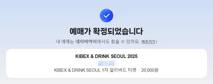 결제가 완료되면 예매가 확정됩니다. 1차 얼리버드 티켓 예매 완료를 했네요 ㅎㅎ 참고로 저는 1차 얼리버드 티켓 구매 가능기간에 예매를 해서 아래와 같이 나오니 헷갈리지 말아 주세요!!
