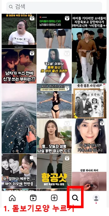 인스타그램에서 하단에 돋보기 모양을 누릅니다.