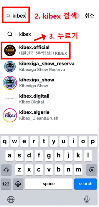 검색란에 'kibex'를 검색하고 'kibex.official'을 누릅니다.
