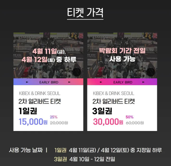 현재는 1차 얼리버드 티켓 판매 기간이 끝났고 3.17(월) ~ 4.6(일)까지 2차 얼리버드 티켓을 판매하고 있답니다. 박람회 방문 생각이 있으시다면 할인된 가격으로 예매하실 수 있는 기회를 잡아보시는 건 어떨까요?