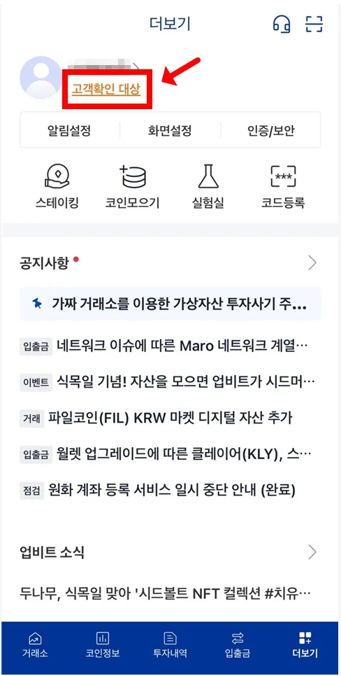 화면 위쪽에 '고객확인 대상'을 누릅니다.