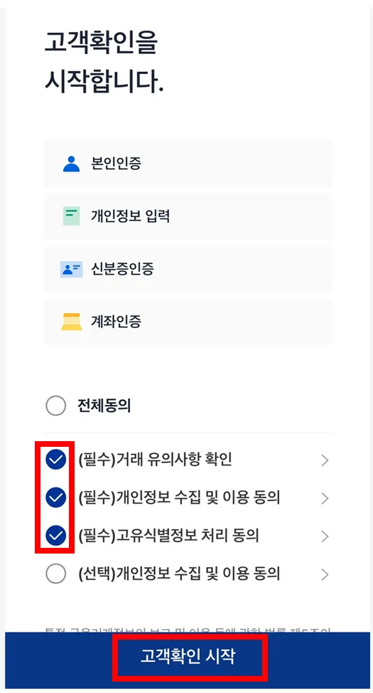 5. 필수 동의사항에 체크하고 '고객확인 시작' 누르기