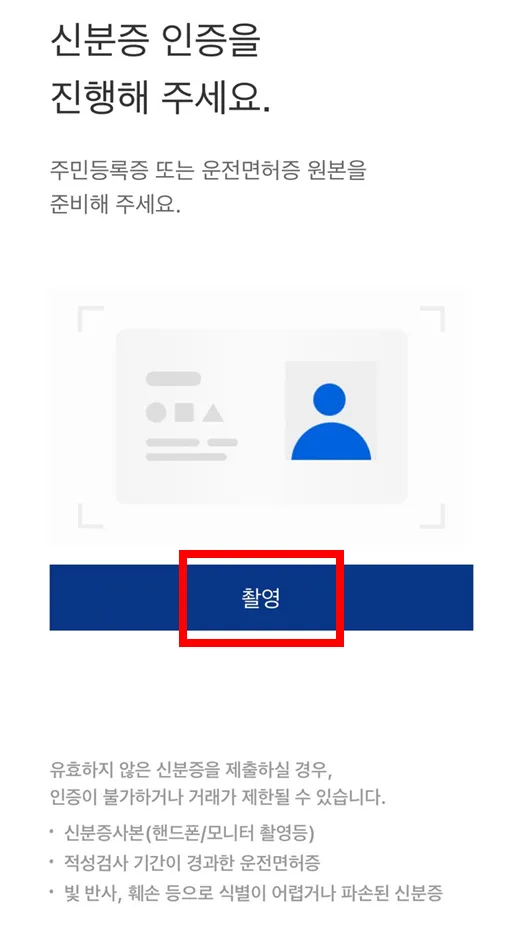 '촬영'을 눌러서 주민등록증 또는 운전면허증 원본을 찍은 후 하단에 '확인'을 누릅니다.