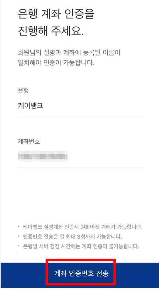 하단에 '계좌 인증번호 전송'을 눌러 인증을 진행합니다. 나의 케이뱅크 계좌로 온 숫자 3자리를 입력하고 '1원 인증하기'를 누르면 끝입니다.