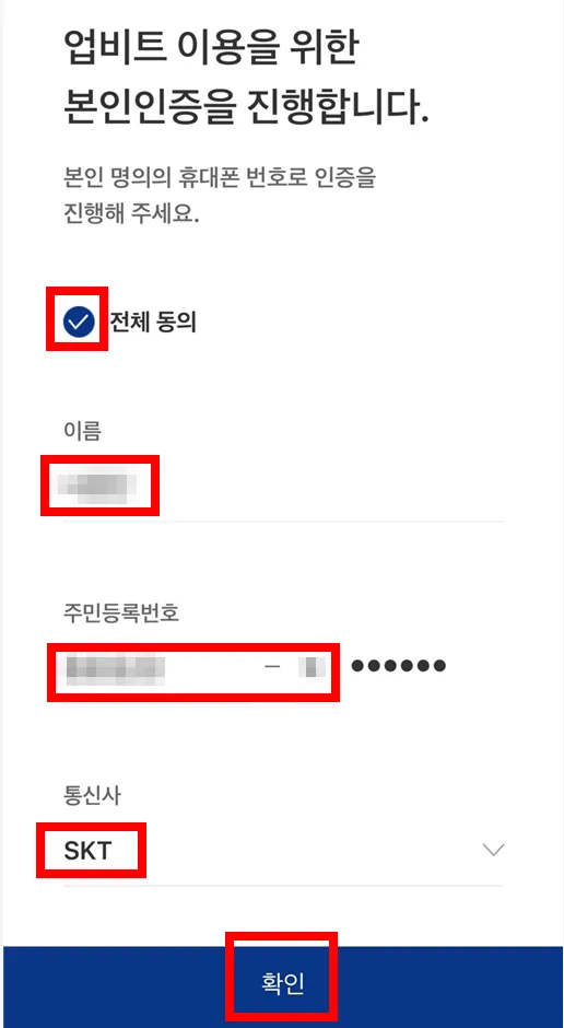 본인 명의 휴대폰 번호로 인증을 진행하고 하단에 '확인'을 누릅니다.