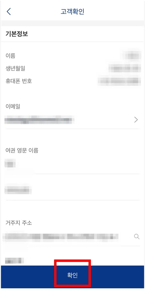 본인의 정보 확인 및 필요시 수정합니다. 이메일 인증 후 하단에 '확인'을 누릅니다.